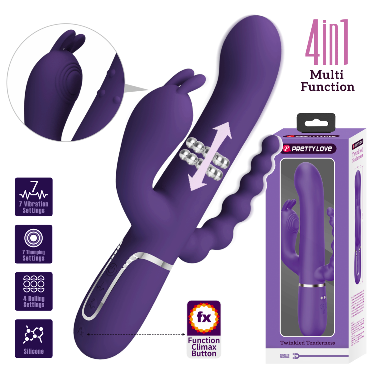 ¡Triple estimulación con vibraciones extra potentes! El Vibrador Triple Estimulación de Pretty Love es un vibrador conejito elegantemente curvado con estimulador anal que proporciona estimulación vaginal, clitoriana y anal simultánea.